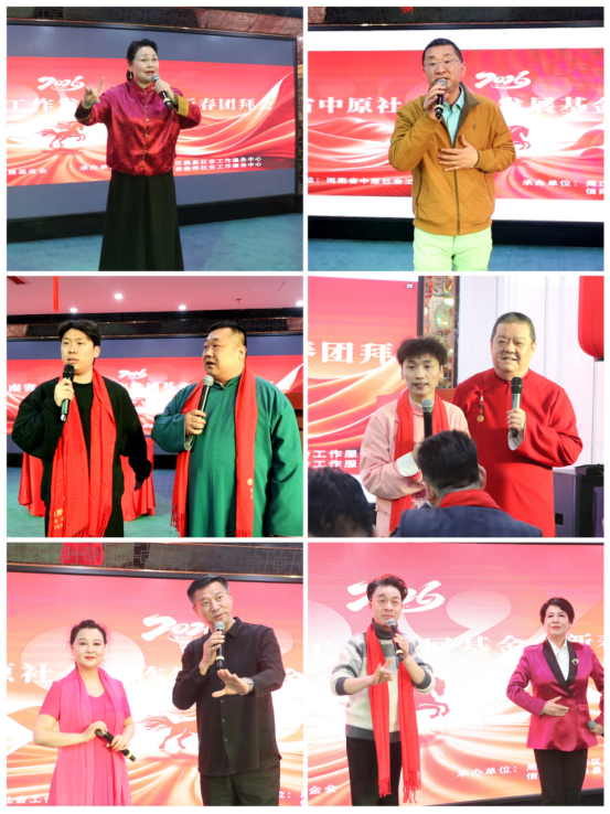 精彩的文艺节目为团拜会增添了浓厚的新春气氛。基金会秘书长余亚梅为知名相声演员潘凯颁发“爱心大使”荣誉证书。随后,潘凯及其团队表演了欢乐的相声段子。《星光大道》明星评委王勇倾情献唱《人间第一情》《涛声依旧》;戏曲表演艺术家娄玉凤带来了《穆桂英挂帅》《 辕 门外三声炮如同雷震》等经典豫剧选段,引来阵阵喝彩。歌曲、小品等节目接连上演,现场掌声不断。