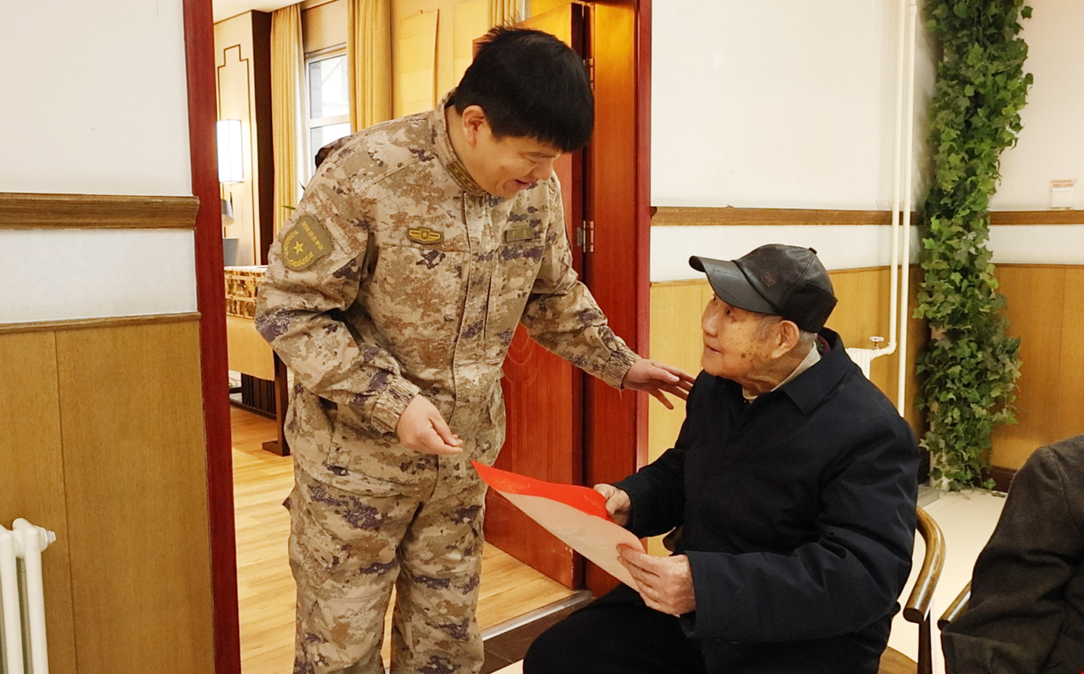 103岁的老干部何胜接过大红的福字,也激动地为祖国献上祝福:“值此新春到来之际,祝祖国繁荣昌盛,愿人民生活幸福。”