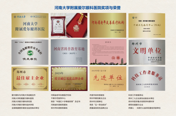 十年深耕,硕果累累,河南大学附属爱尔眼科医院(郑州爱尔眼科医院)凭借过硬的医疗品质、优质的服务与突出的行业贡献,斩获国家、省、市、区级多项荣誉,成为中原眼科医疗领域的标杆。医院先后荣获中国红十字奉献奖章、国家级科技型企业、河南省及郑州市两级科普教育基地、河南省老年友善医疗机构等荣誉,更连续荣获“百姓满意医院”称号,郑州市五一劳动奖章、二七区最具社会责任企业、抗疫先锋奖等荣誉更是对医院医疗服务与社会担当的高度肯定。