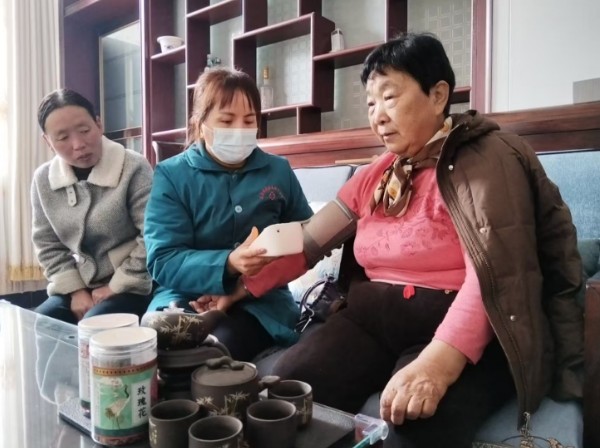 2月23日下午4时,焦作市武陟县龙泉街道东马曲村第三卫生室内,村医安香枝正在为乔冬菊测量血压。