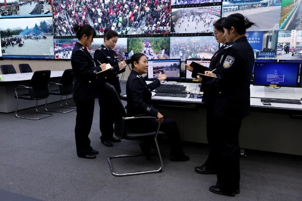 “通知应急特警力量抓紧到位,严格控制入口处人流数量……”指挥大厅内,女警们紧盯屏幕上不断跳动的数据与实时画面,指尖在电脑键盘上翻飞不停,一条条指令随着键盘敲击声不停发出,将一张张看不见的安全网悄然铺展在城市的每一个角落。