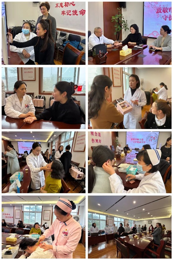 讲座结束后,中医义诊服务同步启动,把优质服务送到女职工身边。刘革命主任现场把脉问诊、辨证施治,精准研判身体状况;郑芳丽副主任通过体质辨识仪检测,为职工量身定制个性化体质调理方案;陈文竞、张瑞、王莉等护士长带领团队,现场开展耳穴压豆、火龙罐、刮痧等中医特色外治疗法体验,耐心解答各类健康疑问,细致指导日常养生细节,用专业服务守护女职工健康。