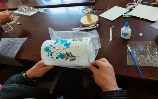 活动现场暖意融融,干花、灯座、胶水等材料整齐摆放。志愿者与工作人员细致讲解压花选材、构图搭配、粘贴定型等技巧,手把手指导大家制作。妇女姐妹们兴致盎然,认真挑选花叶、精心搭配造型,将春日花草与灯光巧妙融合。大家相互交流、互帮互助,现场笑语不断,在慢时光里感受手工之美与创作乐趣。一盏盏别致清新的压花台灯陆续完成,既实用又美观,成为节日里最温暖的礼物。
