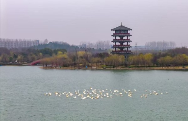 春日的黄龙湿地公园碧波荡漾,129只白天鹅或低头梳理羽毛,或振翅掠过水面,洁白的羽翼与粼粼波光交相辉映。在它们周围,白鹭单脚立于浅滩,绿头鸭结伴潜水觅食,鸊鷉划出串串涟漪……数十种水禽共享这片水域,勾勒出一幅生机盎然的生态画卷。