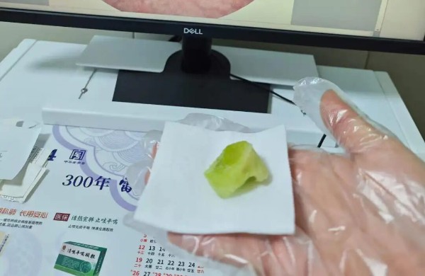 接到通知后,耳鼻喉科医师蔡梦强迅速赶到医院并立即投入到救治工作中。面对表情痛苦、呼吸逐渐困难的老人,蔡梦强医师沉着冷静,迅速在喉镜辅助下为患者进行咽喉部探查。检查发现,一块较大的绿色萝卜异物正牢牢卡在咽喉深处的梨状窝内,压迫周围组织,导致患者出现不适症状。