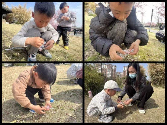 在“收集春天”环节,孩子们小心翼翼地捡拾掉落的花瓣、形态别致的小草,将它们轻轻放进小袋子里。随后,大家围坐在草地上,在老师的指导下开启干花书签DIY之旅:将收集到的花草精心搭配,平铺在透明书签膜中,再用白色线条勾勒出可爱的瓶子轮廓,最后压膜固定。一朵朵小花、一片片绿叶,在孩子们的巧手下变成了独一无二的“春日瓶中信”——有的是粉紫相间的温柔组合,有的是明黄灿烂的活力模样,每一枚书签都藏着孩子们对春天的独特感知。