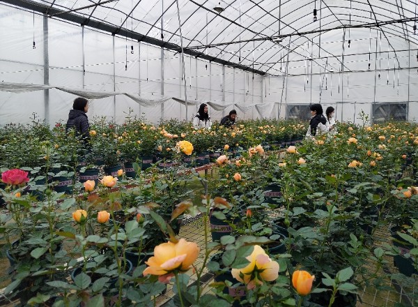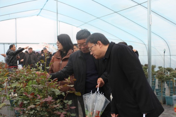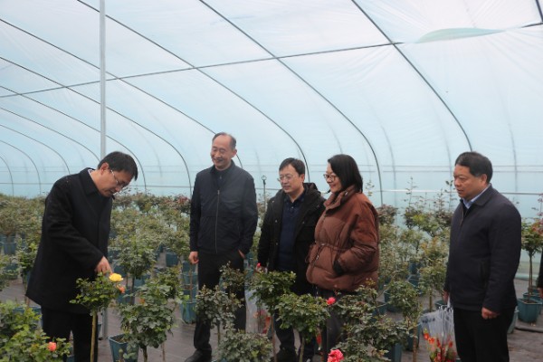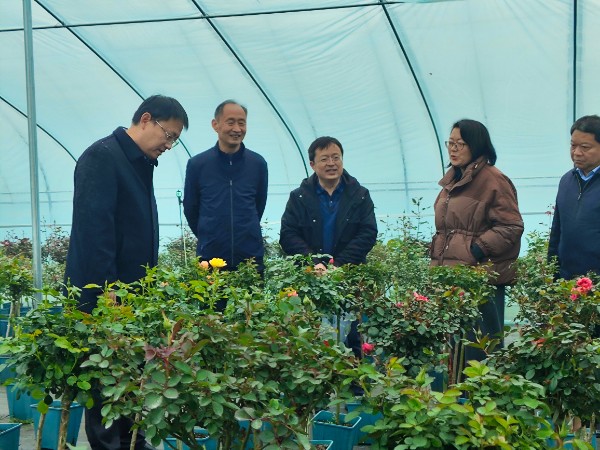 随后,与会人员实地观摩了南阳绿森园艺有限公司、南阳月季基地的月季控花盆花生产。只见温室大棚里一盆盆月季含苞竞放、生机盎然,惊艳之后,众人立刻把项目成员团团围住询问不停。项目通过推广“绝色果汁”等月季优良品种、依托温室大棚环境调控和水肥管理关键技术,打破月季自然生长限制,花期提前2个月;并聚焦年宵花、“三八”妇女节等关键节点错峰上市,有效提升了月季产品经济价值和影响力。