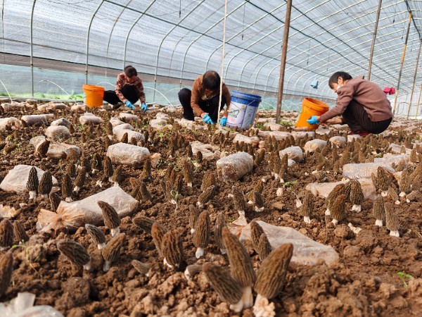 3月21日,宝丰县闹店镇刘集村羊肚菌进入釆摘期,工人正在抓紧时间釆摘羊肚菌。刘集村以羊肚菌为核心,联动平菇、蔬果等多个品种,走“企业+基地+合作社/农户”模式,形成集种植、烘干、销售于一体的产业链。