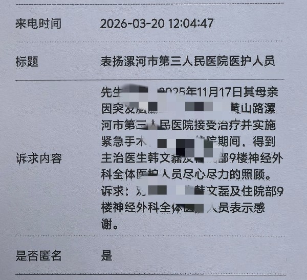 近日,漯河市第三人民医院(市妇幼保健院)收到一份来自市长热线的表扬工单,一位匿名市民时隔数月,专程通过政务平台为医院神经外科医护人员送上诚挚感谢,朴实的话语里满是对医护人员的认可与感激。