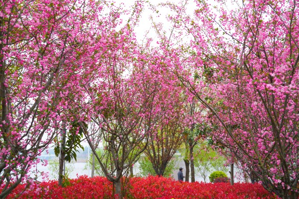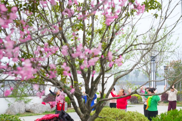3月24日,淮滨县西湖花红柳绿,空气清新,鸟儿鸣唱。湖畔各色花开,老人们聚在一起跳起欢快的广场舞,有的则伸展伸展胳膊腿,沿湖锻炼身体。