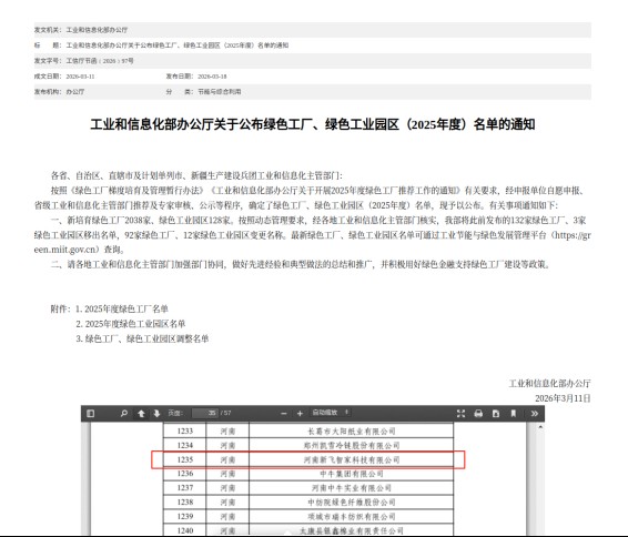 近日,国家工业和信息化部正式发布《工业和信息化部办公厅关于公布绿色工厂、绿色工业园区(2025年度)名单的通知》(工信厅节函〔2026〕97号),河南新飞智家科技有限公司凭借在绿色制造领域的扎实实践与突出成效,成功获评国家级绿色工厂,成为新乡高新区绿色转型发展的又一标杆企业。