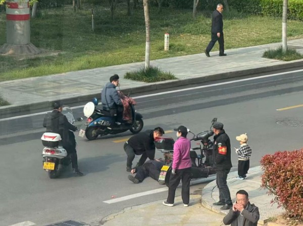 据现场目击者描述,当天上午9时左右,一名老人骑着电动车带着小男孩沿河堤北路行驶时,突然不慎摔倒,电动车侧翻在地,老人重重摔在路面后便失去动静,小男孩则被摔在一旁,吓得大哭不止。