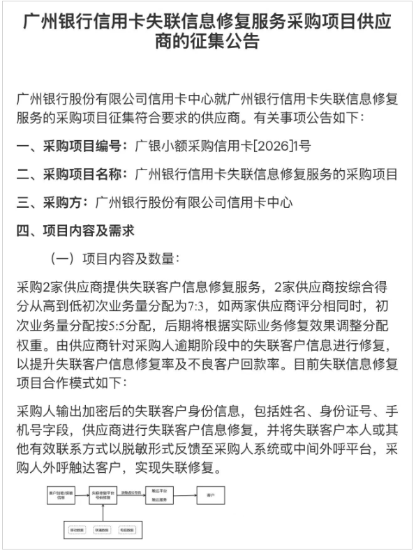 比如,招投标网站公告显示,今年3月,广州银行信用卡发布《失联信息修复服务采购项目供应商的征集公告》,明确提及“采购人输出加密后的失联客户身份信息,包括姓名、身份证号、手机号字段,供应商进行失联客户信息修复,并将失联客户本人或其他有效联系方式以脱敏形式反馈至采购人系统或中间外呼平台,采购人外呼触达客户,实现失联修复。”银行通过第三方供应商,较多是通信运营商,开展此类业务,因此合规授权是此类业务开展的核心前提。
