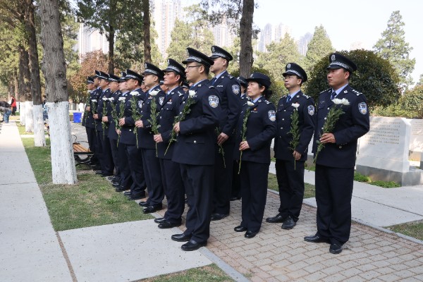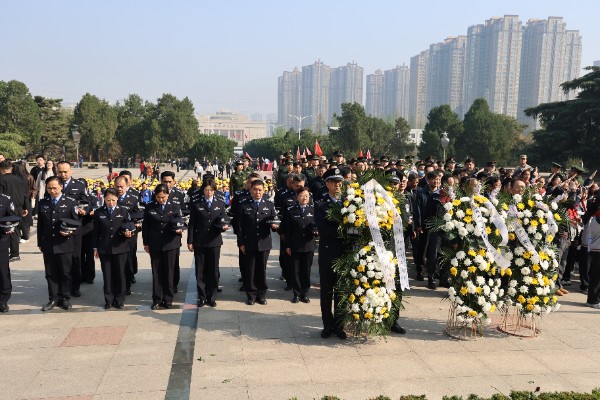 在庄严肃穆的革命烈士纪念碑前,全体人员警容严整、列队肃立。警察代表缓步上前,向革命先烈敬献花篮,所领导仔细整理花篮缎带,全体人员肃立默哀,以最庄重的方式表达对革命先烈的深切哀思和崇高敬意。