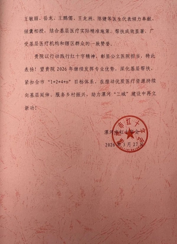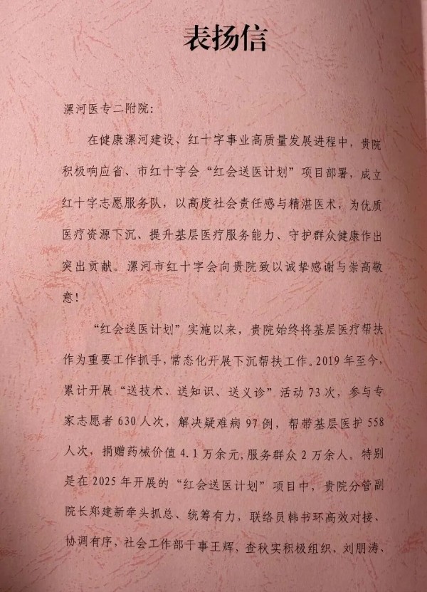 4月2日,漯河市红十字会副会长杨浩、组宣部部长王丽博为漯河医专二附院(漯河市骨科医院、漯河市立医院)送来表扬信,对医院积极响应“红会送医计划”、常态化开展基层医疗帮扶工作的突出成效给予高度肯定。