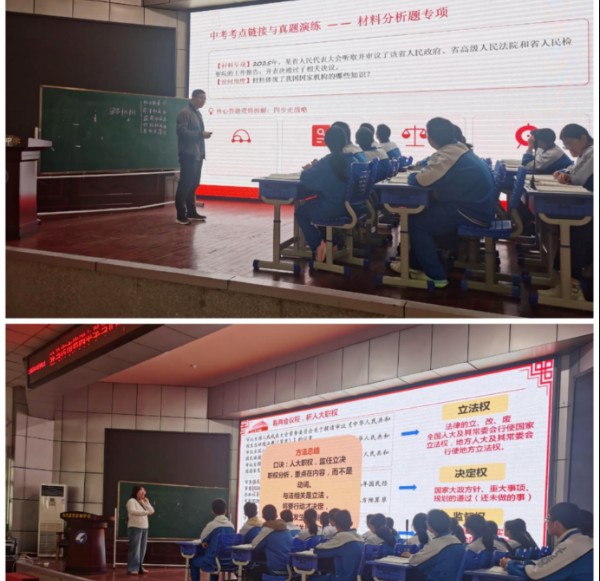 赵琳娜老师以身体比喻、顺口溜等生动方式,让学生轻松掌握“一府一委两院”的性质职权;通过易混易错辨析与中考演练,提升精准作答能力,厚植家国情怀。陈付磊老师以学校组织架构类比导入,学生手持“宪法尺子”辨识机构,在分享亲身经历中感悟制度力量。两节课一重情境生活化,一重知识结构化,共助学生增强宪法意识与国家认同。