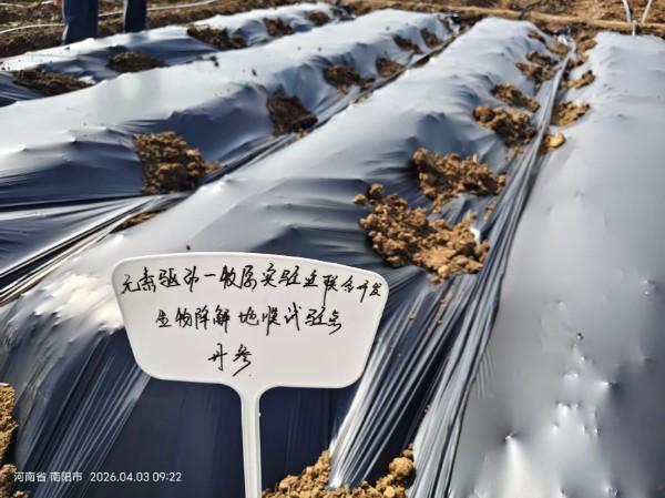 4月3日,南阳市科学院联合南阳市西湖牧原合成生物研究院专家团队,将最新研制的全生物降解地膜及配套覆膜技术,送至方城县四里店镇中恒健(河南)中药材开发有限责任公司丹参种植基地,标志着这一绿色生产技术在南阳丹参主产区正式进入示范应用阶段。
