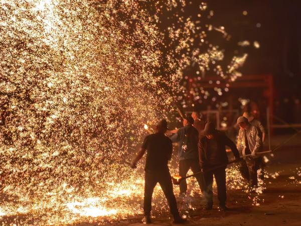 随着炉火烧得愈发通红,熔化的铁水泛着耀眼的光泽,零星铁花从炉中溅出,如同散落的星火。打铁花的师傅们个个精神抖擞、卯足劲头,一人手持舀勺,稳稳盛满滚烫的铁水,另一人紧握击打工具,伴随着清脆的击打声,滚烫的铁水被奋力抛向空中,刹那间,漫天铁花飞溅开来,如星河倾泻、似烟花绽放,绚烂夺目。看得现场观众目不暇接、连连惊叹,大家纷纷拿起手机记录下这精彩时刻。