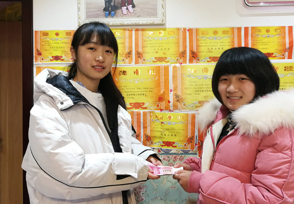 马铭悦和徐文婷很快成为无话不谈的好朋友,经常一起学习交流,分享女孩子之间的小秘密。在相互影响下,马铭悦养成了勤俭节约的好习惯,每年都将压岁钱和省下来的生活费共3000元交给徐文婷购买学习用品。2019年10月1日是新中国70华诞,马铭悦早早策划,利用国庆小长假带着徐文婷走进车站、商场、公园等人员密集场所,热心向路人售卖小国旗,积极传播爱国主义精神,所得500多元收入全部用于贴补徐文婷日常开支。