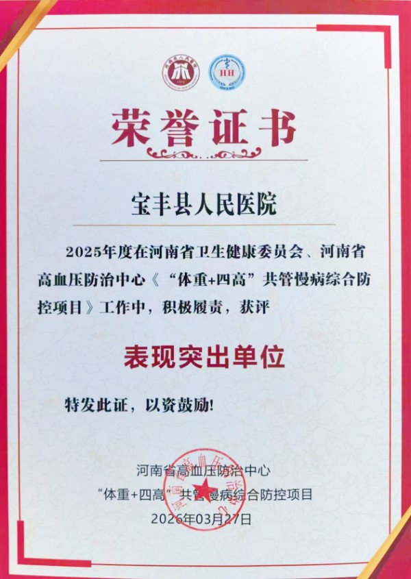 日前,在2026年豫北区域县级高血压防治中心工作会议上,宝丰县人民医院获评2025年度河南省《“体重+四高”共管慢病综合防控项目》“表现突出单位”。这一荣誉是对医院慢病防控工作的充分肯定,也彰显了河南省“体重+四高”共管项目在基层落地的显著成效。