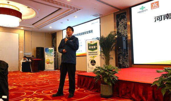 随后,河南省农服集团市场部经理陈战锋、顾问王德新分别带来专题分享,前者详细介绍了集团成立背景、河南、广东双方省供销合作总社对集团的支持、集团业务布局及发展历程;后者精准分析了当前河南省小麦、花生、玉米等主要作物病虫害发生态势,为现场渠道伙伴提供精准的市场与农技参考。