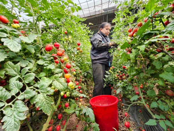 采摘时节的大棚里,忙碌与欢喜交织成最美的乡村风景。村民们提着鲜红小桶,穿梭在藤蔓垄间,指尖轻捏果蒂,手腕微微一旋,一颗颗饱满紧实的小番茄便稳稳落篮。动作娴熟流畅,笑语盈盈回荡,每个人的脸上都漾着藏不住的笑意,这笑意里,有丰收在望的满足,有务工增收的踏实,更有日子节节攀升的幸福。