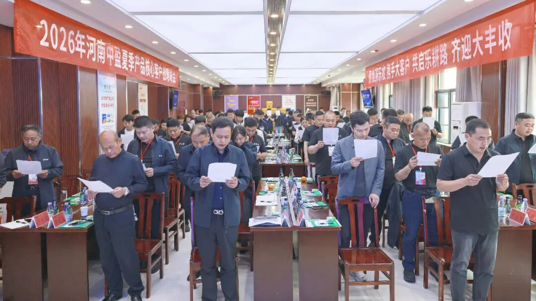 为赋能广大合作伙伴抢占市场先机,助力更多种植户增产增收,合力为夯实夏粮丰收基础贡献力量,河南中盈于4月15日在生产基地举办了以“同心同行,共筑粮安”为主题的2026年河南中盈夏季产品核心客户战略峰会。河南瀚斯集团副总经理、河南中盈总经理申先锋,中盈销售总监孙董董,市场总监吴从稳,市场部副总监侯让星等与来自各地区的100多位核心合作伙伴参加了会议,共谱合作共赢新篇章。