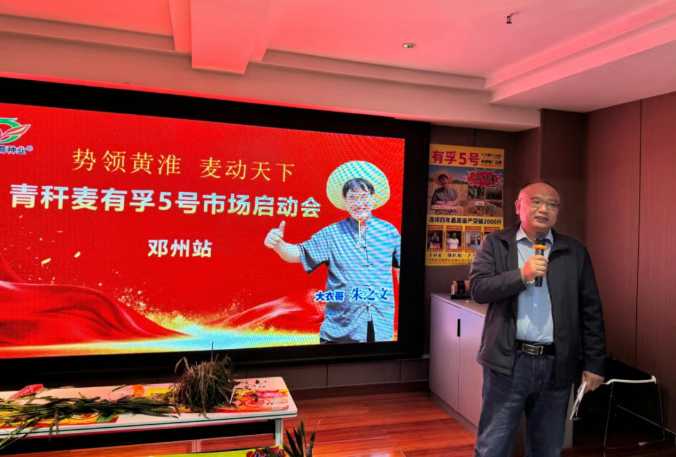 公司执行经理汪凡系统介绍了有孚 5 号的育种历程与核心优势,重点围绕邓州小麦种植的气候与土壤特点,深入解析了该品种青秆、大穗、高产、广适的特性。