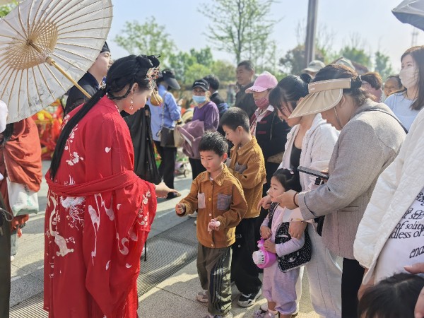 就在这时,耳边锣鼓声骤然响起。非遗旱船巡游队伍从游客中心出发,粉缎扎成的彩船随鼓点起伏摇曳,船头的“艄公”白须飘飘,唱腔诙谐,逗得路边老人笑得合不拢嘴;队伍行至自然博物馆前,原本围观的人群忽地爆发出掌声——主舞台上“花神说媒”环节正到高潮:一身霓裳的“花神”手持花枝,将一位腼腆的年轻小伙请上台,几句俏皮话逗得他耳根通红,台下观众齐喊“缘分到了”,气氛热烈如春潮。