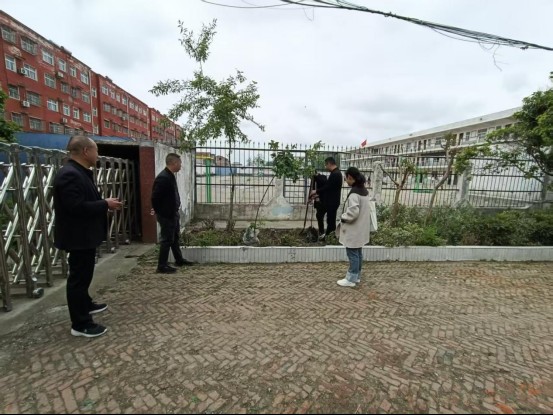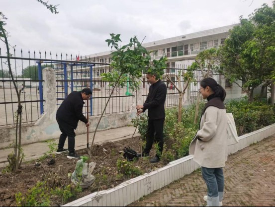 几位学生看到老师们忙碌的身影,也主动要求参与。他们自发去接水,为刚栽下的桃树浇水。老师们挖坑培土,学生们提水浇灌,分工明确、配合默契。短短15分钟的课间时间,两棵桃树便稳稳地扎根在校园中。