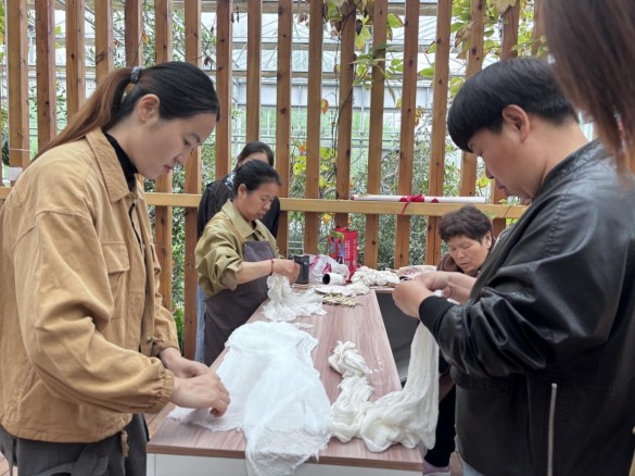在扎染体验环节,老师首先详细讲解了扎染这项国家级非物质文化遗产的历史渊源、工艺原理与艺术特色,通过实物展示、步骤拆解,让大家直观了解从图案设计、折叠捆扎到浸染上色的全流程。随后,在老师一对一指导下,残疾朋友们兴致勃勃地拿起素布、皮筋、夹子等工具,认真学习折叠、扎结、夹压等基础技法,用自己的创意赋予布料独特造型。大家相互协助、交流心得,从生疏尝试到熟练操作,每一步都充满专注与热情。当浸泡、固色、漂洗完成,解开捆扎线绳的瞬间,一块块素布绽放出独一无二、变幻无穷的蓝白花纹,大家看着亲手制作的扎染作品,脸上洋溢着自豪与喜悦的笑容,纷纷拍照留念,感受传统手工艺“指尖生花”的神奇魅力。