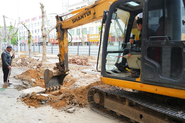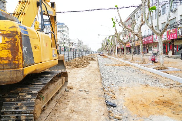 图为淮滨县民政路南段工人正在进一步加快城区街道改建提质工程。