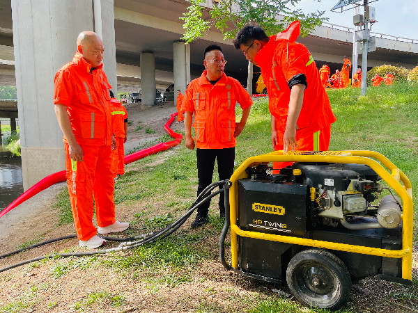移动泵车应急抽排作为本次演练的核心科目,模拟重点路段遭遇强降雨后大面积积水的紧急场景。接到积水处置指令后,移动泵车组迅速奔赴指定点位,队员们分工协作、规范操作,快速完成车辆停靠、管道对接、设备调试、警戒布设等一系列流程,随后启动移动泵车抽排作业,强劲水流沿管道有序排出,积水水位快速下降,充分展现了“拉得出、顶得上、打得赢”的实战水平,全面检验了应急响应、协同处置、高效排涝等全流程作战能力。