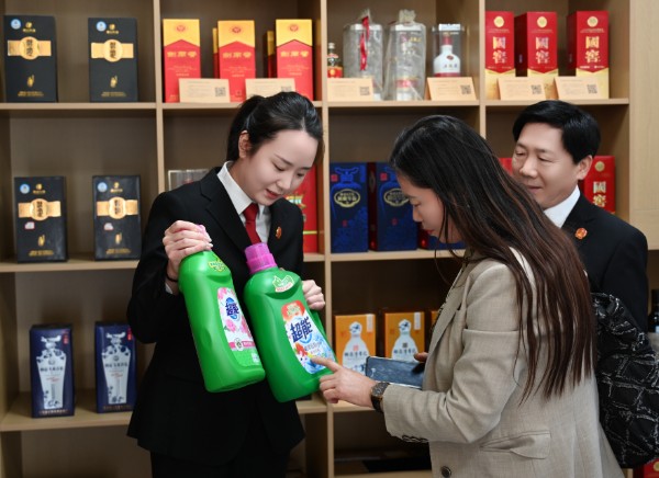 在二楼的侵权物品展示厅,代表委员们经历了一场特殊的“感官教育”。这里陈列着该院近年来审理的各类知识产权案件中查扣的侵权实物——从仿冒知名品牌的白酒、日化品到盗版书籍、玩具。