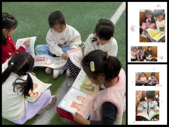 室内书香袅袅,户外童趣盎然。活动最后,幼儿园充分利用园区环境,组织全体幼儿开展草坪户外阅读活动。温暖的阳光、清新的微风、柔软的草坪,构成了最美的阅读场景。孩子们三两成群,围坐在一起翻阅绘本,自主阅读、互相分享故事,沉浸式享受阅读时光。脱离教室的束缚,孩子们在自然中读书,在书香中嬉戏,让阅读变得自由、治愈且充满乐趣。