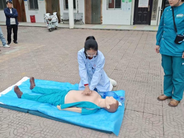 院内实操区,镇平县人民医院急诊科魏丽茹老师现场示范心肺复苏术,从体位摆放、按压部位到人工呼吸配合,手把手指导参训人员练习,确保每一个动作都符合标准。