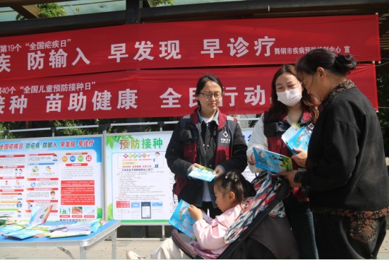 4月24日,在舞钢市垭口街道鑫源广场,舞钢市疾病预防控制中心和市中医院的医务人员给前来的居民群众宣传普及儿童预防接种知识。第40个全国儿童预防接种日之际,该市各医疗机构同步开展以“预防接种 苗助健康 全民行动”为主题的宣传活动。