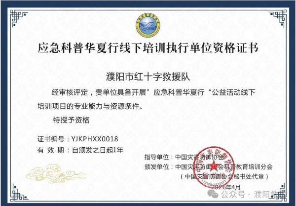 “应急科普华夏行”是中国灾害防御协会联合发起的全国性公益线下培训项目,扎实推进安全宣传进企业、进校园、进机关、进社区、进农村、进家庭、进公共场所,深入基层开展安全知识宣讲与应急技能实操培训,切实提升公众风险防范意识和突发事件应对能力。本次遴选严格按照“公开申报、材料审核、专家评审、社会公示”的程序进行,专家组对全国数百家申报单位进行了多轮综合评审。经过激烈角逐和严格筛选,濮阳市红十字救援队最终成功入选,并获得项目执行单位证书。
