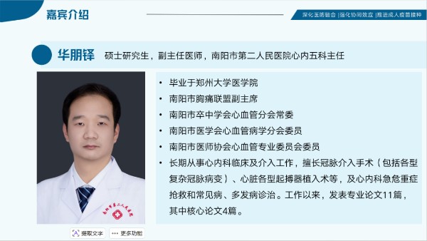 针对中老年群体,心内五科副主任医师华朋铎带来了关于慢性病与带状疱疹关联的深度剖析。他指出老年人罹患带状疱疹可持续增加心脑血管风险十年以上,在心血管疾病防控刻不容缓的当下,关注感染性疾病威胁、通过疫苗接种降低慢病风险具有重要的临床意义。