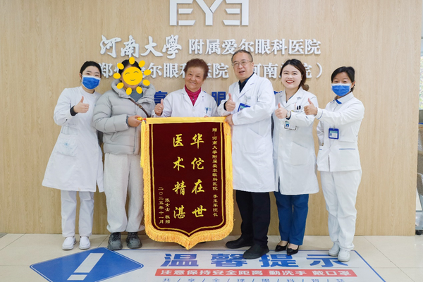 近日,在郑州爱尔眼科医院的眼底病门诊,38岁的张女士,一位近视1200度的眼病患者,将一面书写熠熠生辉的锦旗,郑重地交到了眼底病专家 李玉军教授手中。