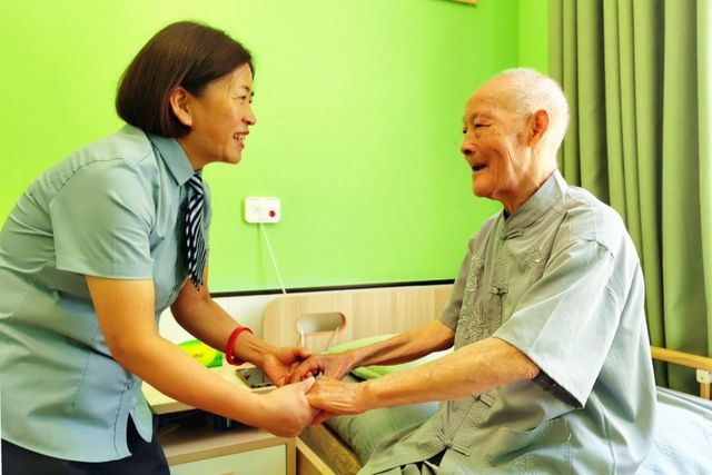 杨天定老人还乐于公益事业,热衷于为社会增添正能量活动。他入住养老院前,因脑梗后遗症,在家摔倒造成尾骨骨裂,导致腿脚不能行走,生活不能自理。刚到养老院的时候,由于长期卧床造成大便不通,腹胀疼痛难忍,在护理员的精心照护下,每天给他人工排便、端尿。经过一段时间的护理、康复,他能从床上站起来,扶着助行器走路了,身体的逐渐康复让老人对生活充满了希望。