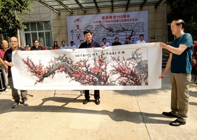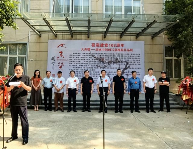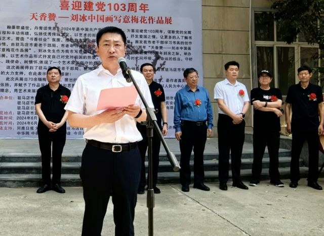 丹青敷彩歌盛世,翰墨流霞颂和谐。为喜迎中国共产党成立103周年,以艺术的形式抒发爱国之情。6月18日,由中共驻马店市委老干部局、市文联、驻马店日报社、驻马店广播电视台主办,市直老干部活动学习中心等单位承办的“喜迎建党103周年——天香赞•刘冰中国画写意梅花作品展”开幕式在市直老干部活动学习中心举行。