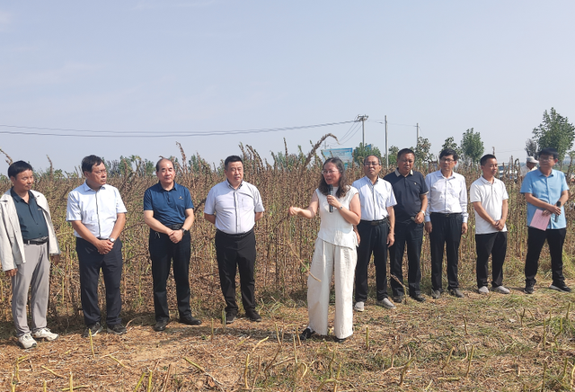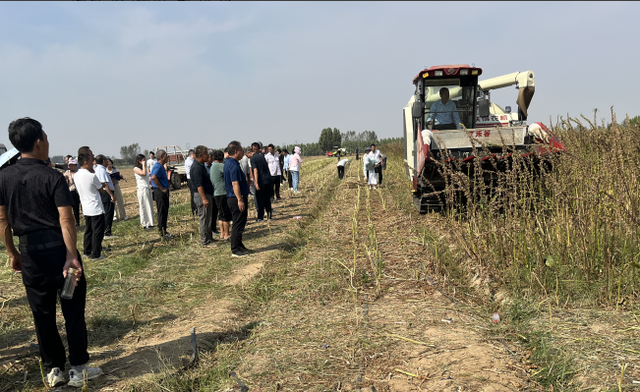首席科学家苗红梅介绍,该示范基地种植的“豫芝ND837”是我国首个抗裂蒴型芝麻品种,由河南省农科院芝麻研究中心选育,该品种蒴果密,蒴果成熟后开裂程度低,籽粒不脱粒,抗旱抗逆性强,适应性广,适于联合收获。强调要充分认识芝麻生产全程机械化的重要意义,结合本地实际,在芝麻栽培管理过程中加强管理,适时喷施生长调节剂、叶面肥等,提高栽培技术,进一步提高芝麻生产全程机械化水平,实现芝麻丰产丰收。