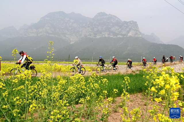 4月5日,骑行爱好者在河南省沁阳市紫陵镇赵寨村“千亩花海”的乡间道路上骑行。