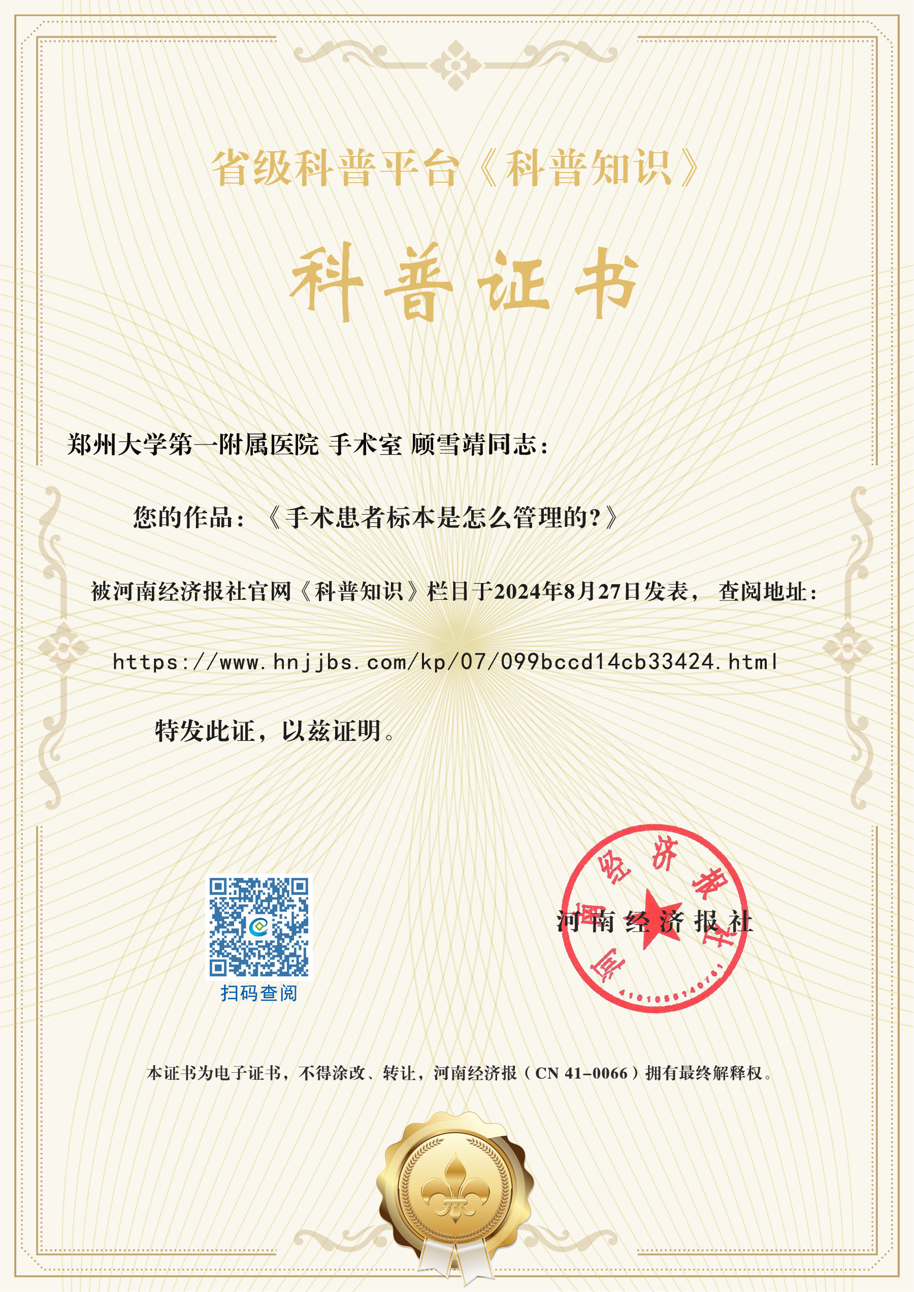 (科普作者姓名:顾雪靖,现职称:主管护师,单位:郑州大学第一附属医院,科室:手术室)