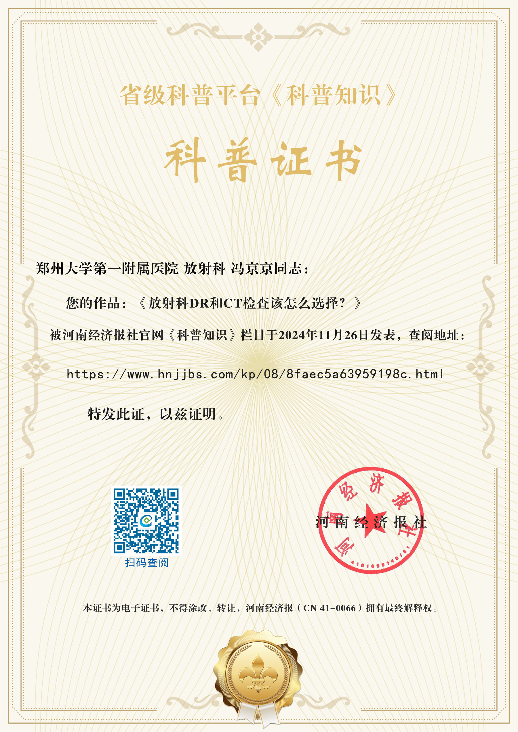 (科普作者姓名:冯京京,现职称:主治医师,单位:郑州大学第一附属医院,科室:放射科)