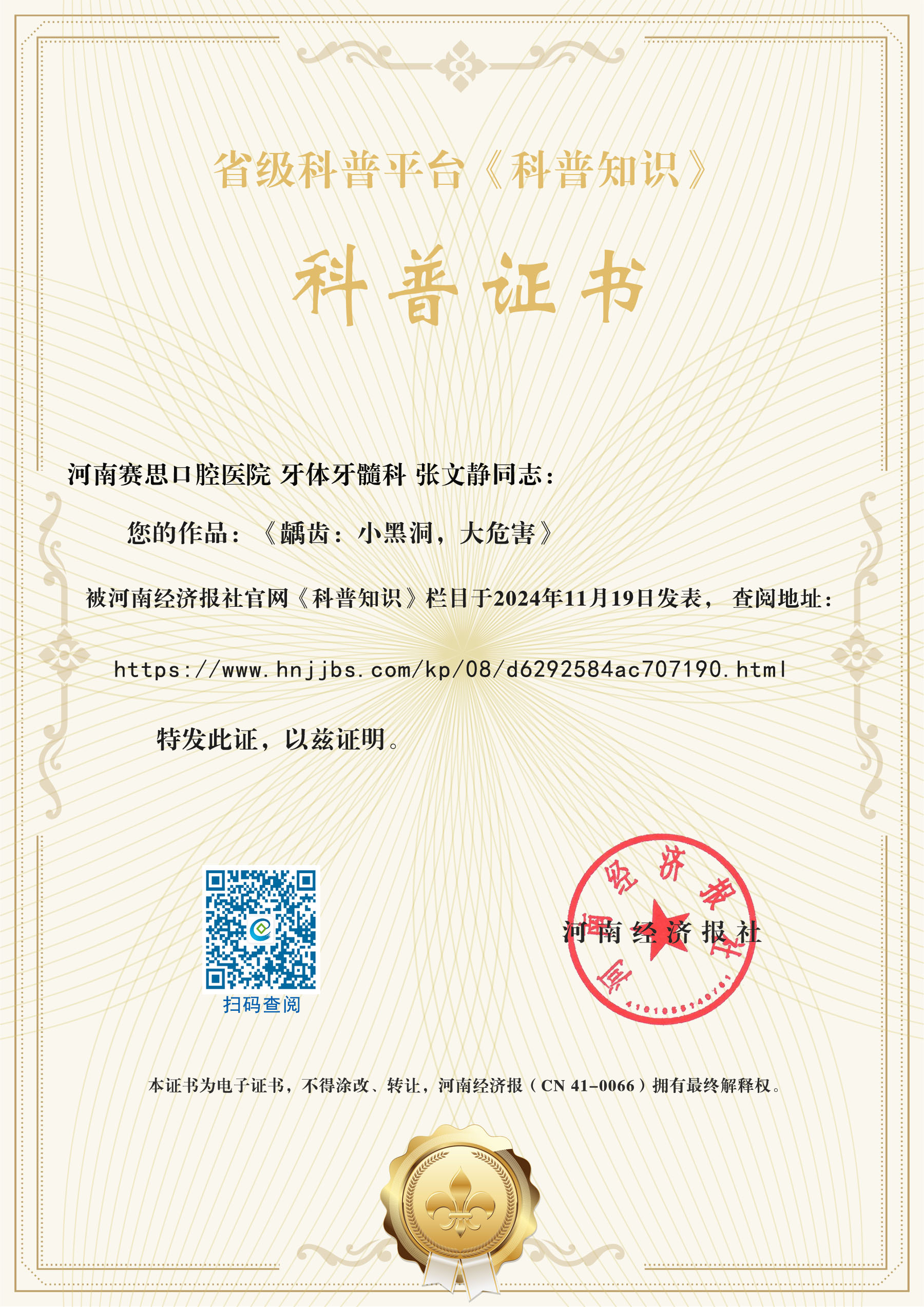 (科普作者姓名:张文静,现职称:主治医师, 单位:河南赛思口腔医院 ,科室:牙体牙髓科)