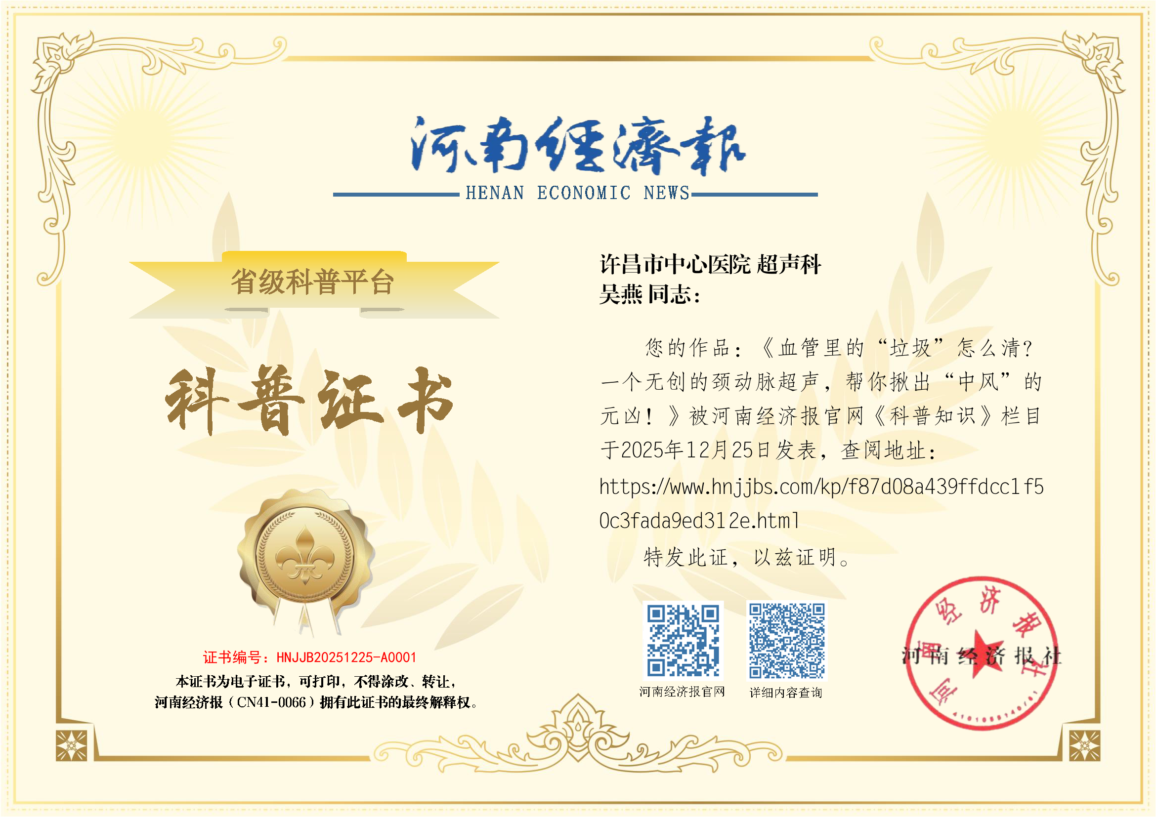 (姓名:吴燕,医院:许昌市中心医院,科室:超声科)