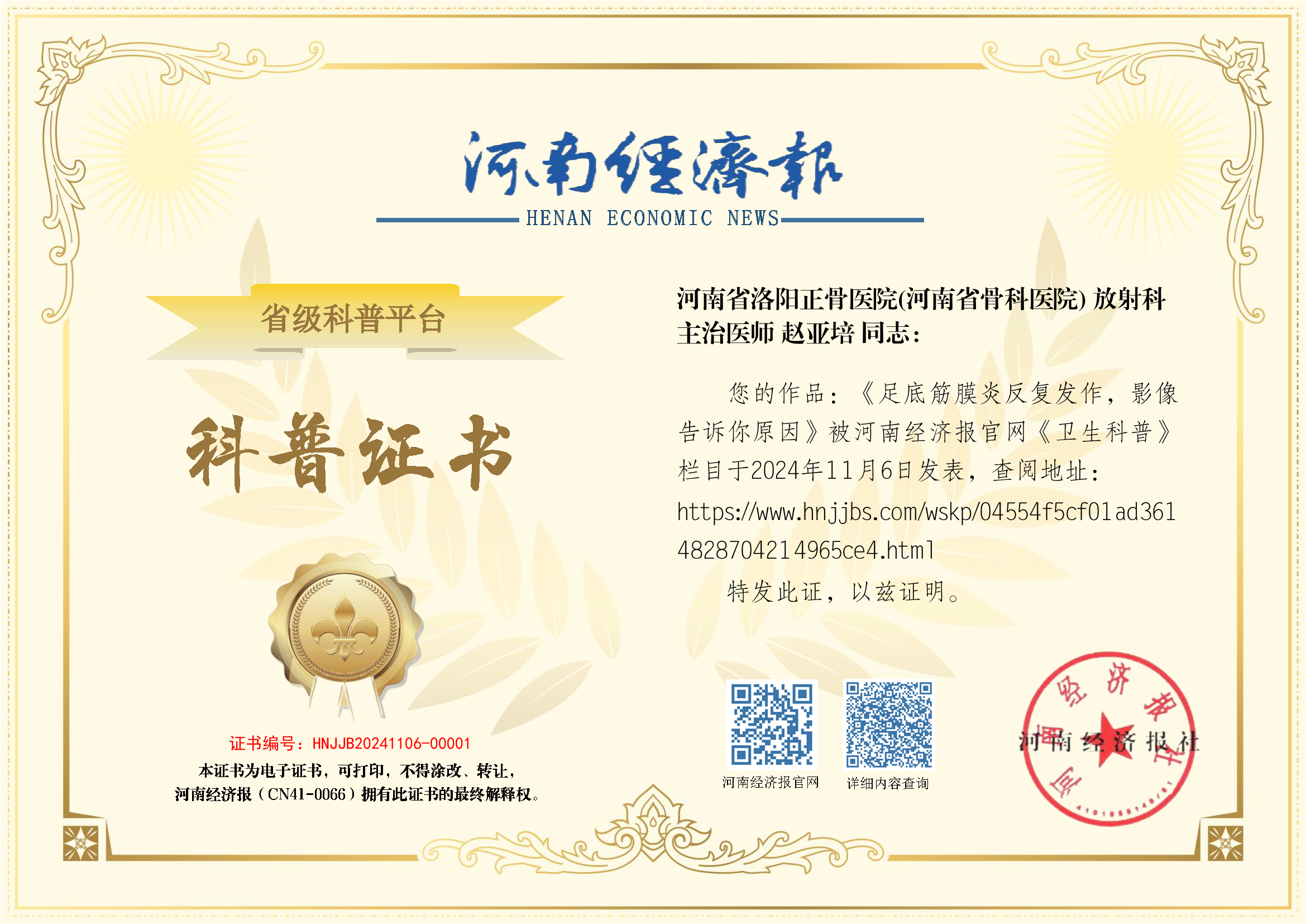 (姓名:赵亚培;医院:河南省洛阳正骨医院(河南省骨科医院); 科室:放射科;职称:主治医师)