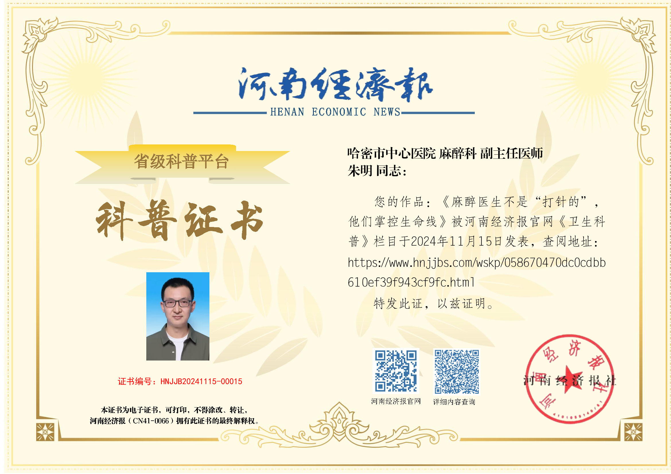 (姓名:朱明;医院:哈密市中心医院;科室:麻醉科;职称:副主任医师)